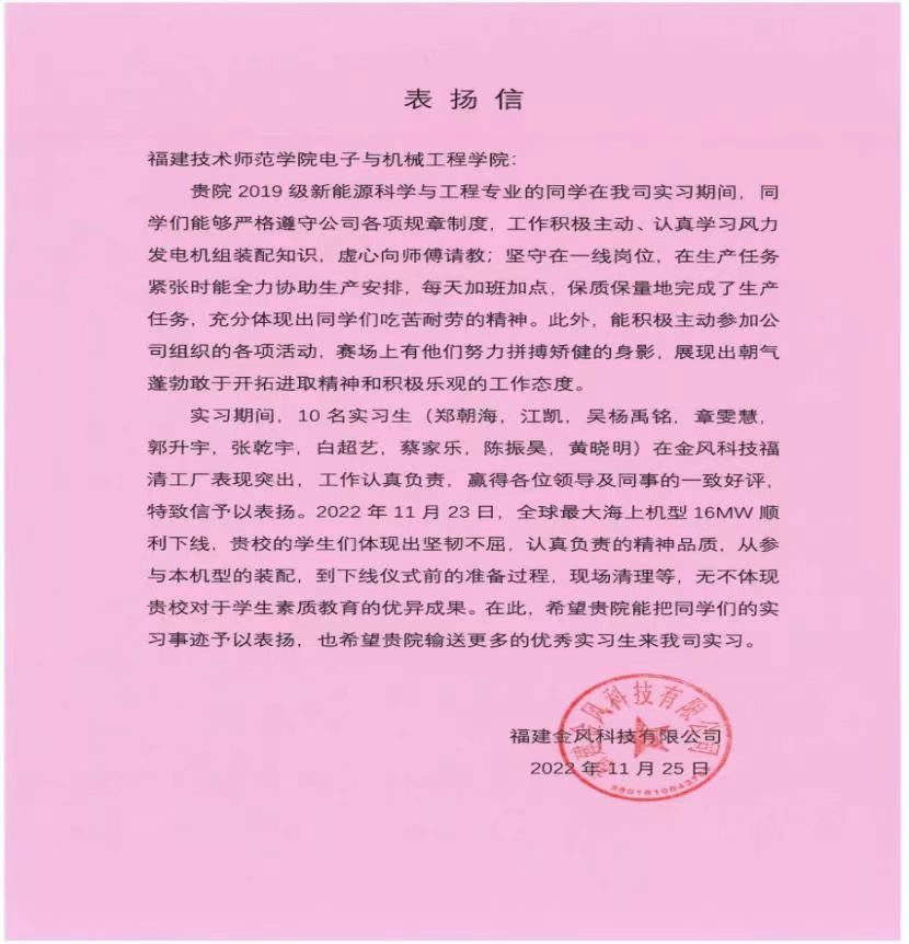 A few days ago, the School of Electronic and Mechanical Engineering received a letter of commendation from Fujian Goldwind Technology Co., LTD. In the letter, Goldwind Technology highly appraises and praises the performance of 10 students majoring in new energy science and engineering from the School of Electronic and Mechanical Engineering of our university.